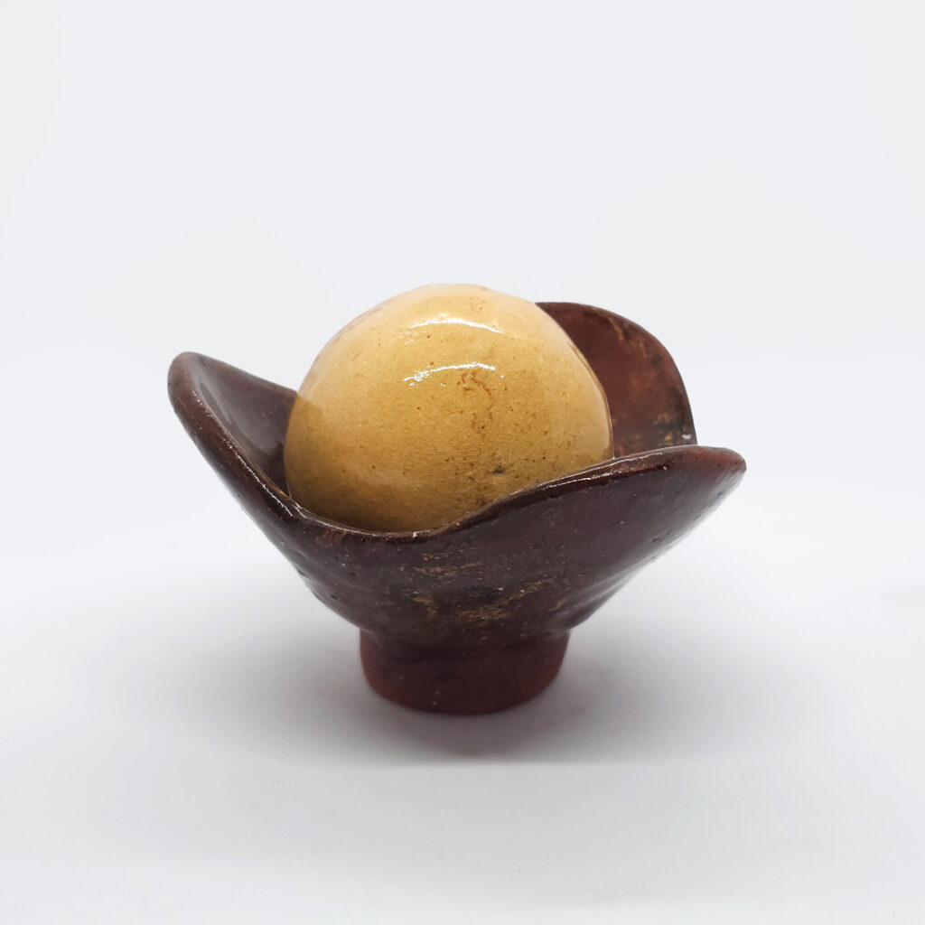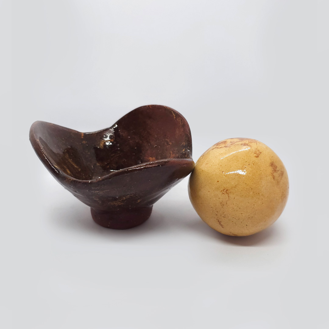 Peça escultural que une forma e equilíbrio. Este centro de mesa artesanal traz uma composição harmônica entre a base em tom terroso escuro e a esfera esmaltada em amarelo suave, criando um diálogo entre contraste e complementaridade. Cada detalhe expressa o gesto da artesã e o caráter único do trabalho manual, transformando o simples em arte.