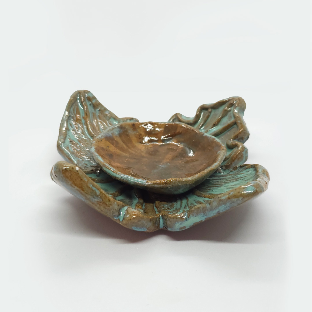 Inspirado nas formas da natureza, este castiçal artesanal revela o encontro entre delicadeza e força. Moldado à mão, suas linhas orgânicas remetem a folhas que acolhem a chama, com esmalte em tons terrosos e esverdeados que criam um efeito de profundidade e movimento. Cada detalhe expressa o toque da artesã e a autenticidade do fazer manual.
