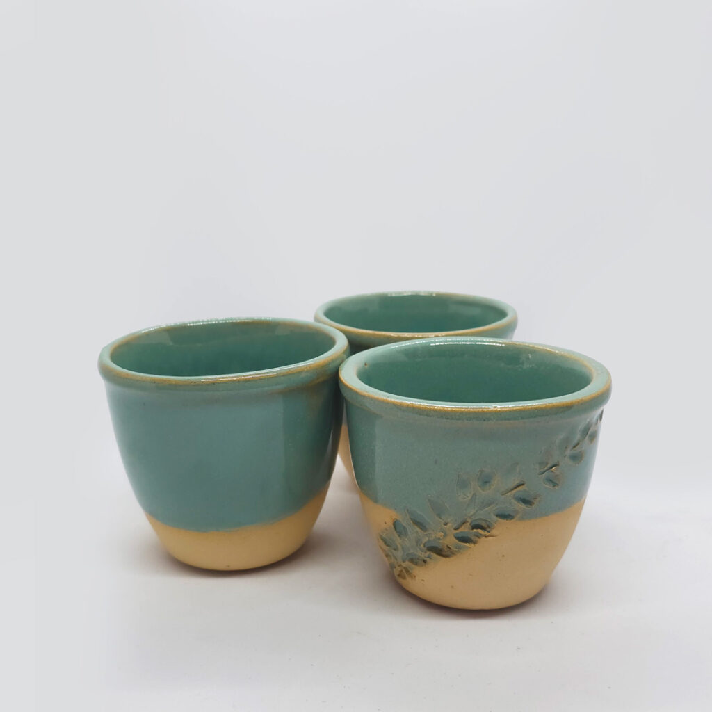 Este conjunto de três copos artesanais combina simplicidade e delicadeza em cada detalhe. Moldados à mão, apresentam o tom natural da argila na base e o esmalte verde suave na parte superior, criando um contraste harmonioso e acolhedor. Um dos copos traz aplicação em relevo de folhas, revelando o toque artístico e sensível da artesã. Cada peça é única, carregando o gesto e a expressão do fazer manual.