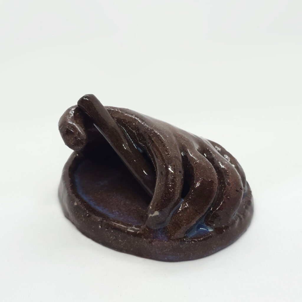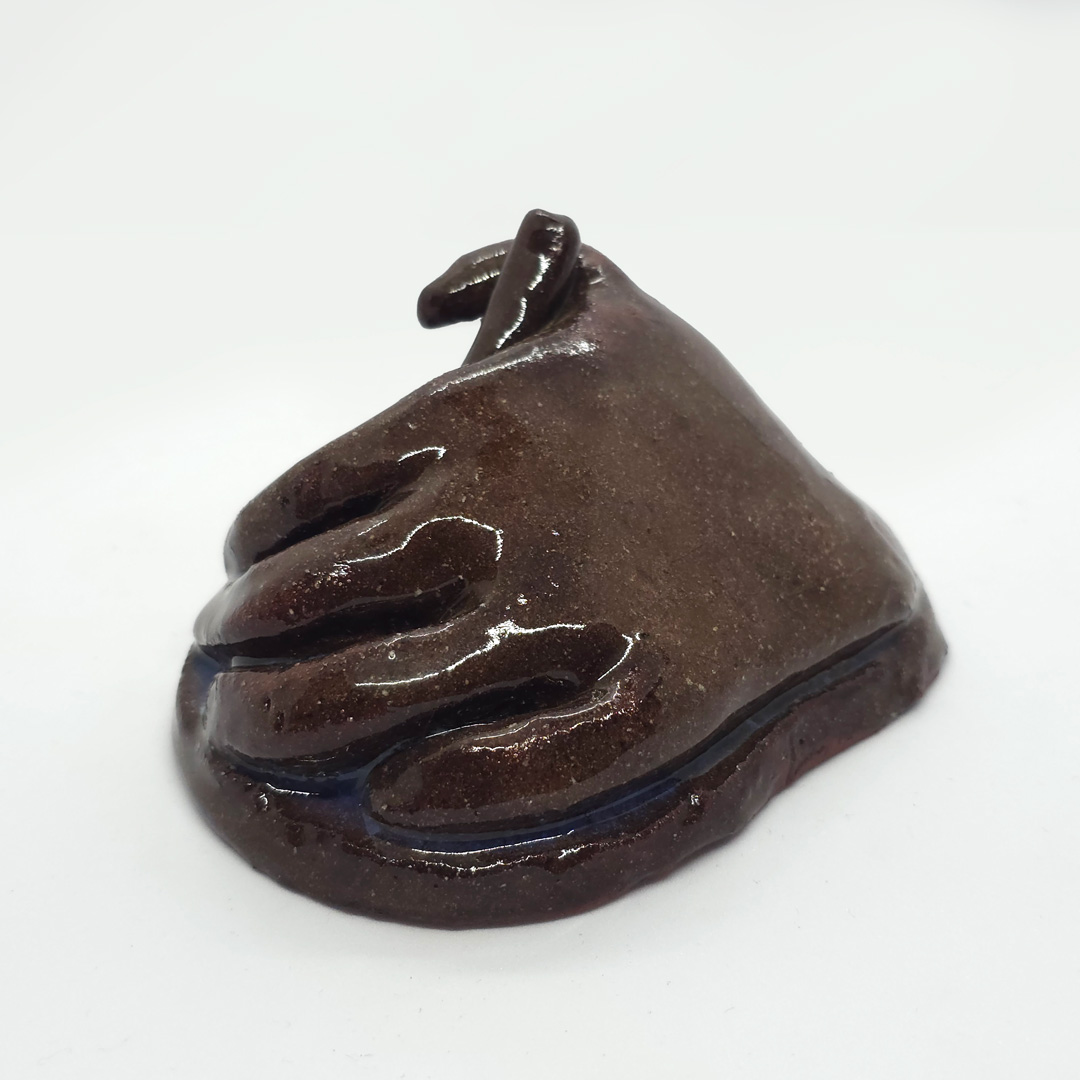 Uma peça que une arte e utilidade. Este porta-caneta em formato de mão é moldado à mão em cerâmica esmaltada, revelando a força simbólica do gesto humano que cria, sustenta e transforma. Suas formas orgânicas e o acabamento em tom marrom profundo evocam o barro vivo e o fazer artesanal, transformando um objeto cotidiano em expressão artística.