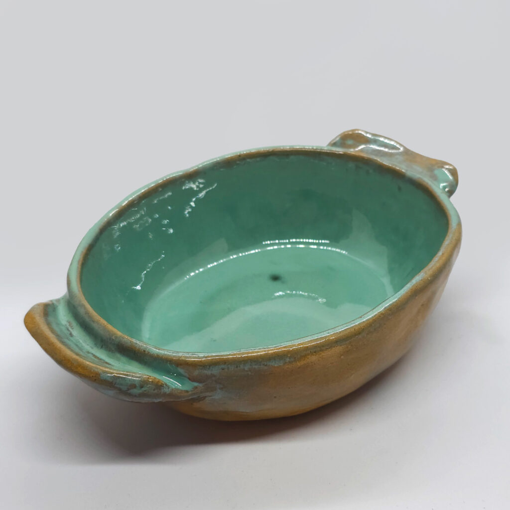 Funcional e encantadora, esta refratária artesanal foi moldada à mão, unindo o tom natural da argila ao brilho suave do esmalte verde. Suas alças laterais conferem praticidade e charme, enquanto as formas levemente orgânicas refletem a naturalidade do trabalho manual. Uma peça que traduz o equilíbrio entre beleza, utilidade e tradição cerâmica.